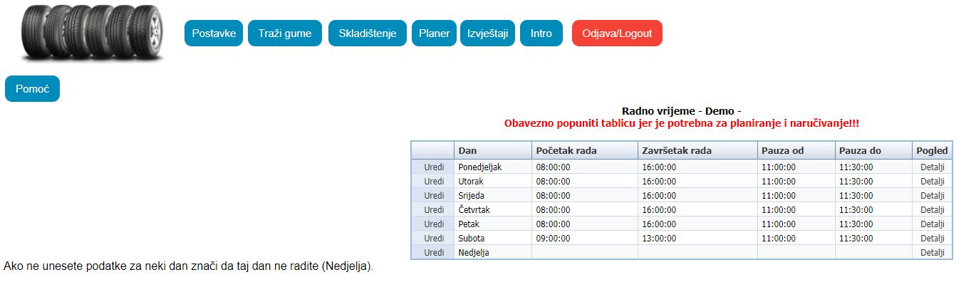Potrebno je za sve dane u tjednu definirati radno vrijeme: Početak, kraj radnog vremena i trajanje pauze.